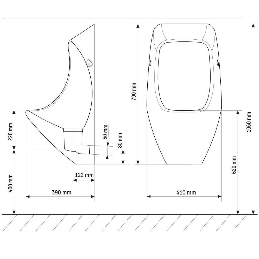 - Rozměry pisoáru - výška 800 mm, šířka 410 mm, hloubka 390 mm.